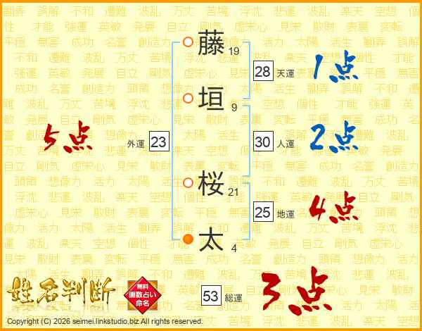 藤(19画)垣(9画) 桜(21画)太(4画)