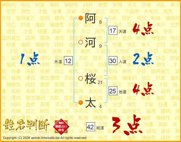 生活面を象徴する運勢です。外部から受ける影響力を表し、結婚運、家庭運や職場、環境への順応性を表します。総運から人運を引いた画数。姓や名が1文字の場合を除く。