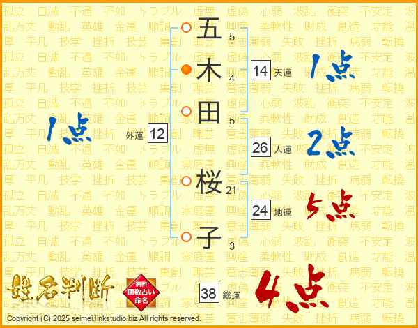 五(5画)木(4画)田(5画) 桜(21画)子(3画)