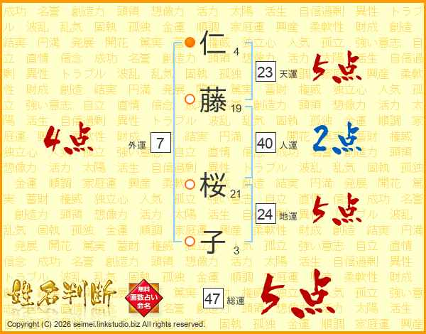 仁(4画)藤(19画) 桜(21画)子(3画)