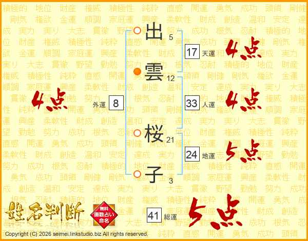 出雲桜子さんの総運は41画の5点!