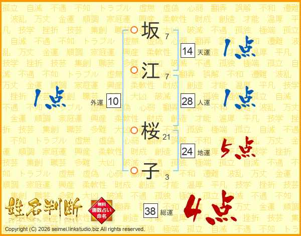 坂(7画)江(7画) 桜(21画)子(3画)