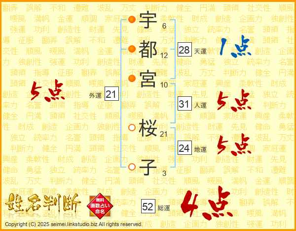 宇都宮桜子さんの総運は52画の4点!