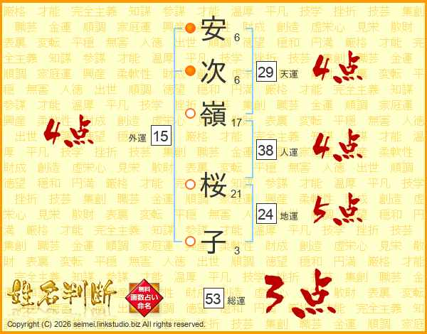 安(6画)次(6画)嶺(17画) 桜(21画)子(3画)