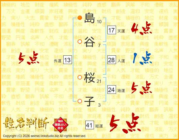 島(10画)谷(7画) 桜(21画)子(3画)