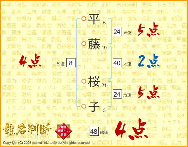 平(5画)藤(19画) 桜(21画)子(3画)
