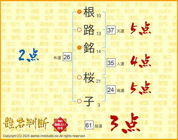 根(10画)路(13画)銘(14画) 桜(21画)子(3画)