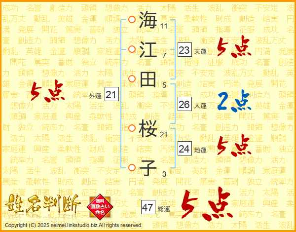 海(11画)江(7画)田(5画) 桜(21画)子(3画)