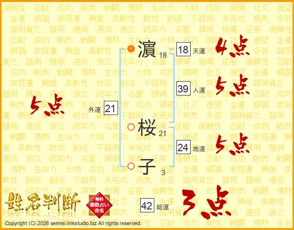 あなたの人生を表す1番重要な運勢です。生涯を通じて影響する総合運となり、主に50歳以降の晩年期に影響を及ぼします。苗字と名前の合計画数。