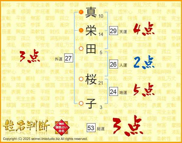 真(10画)栄(14画)田(5画) 桜(21画)子(3画)