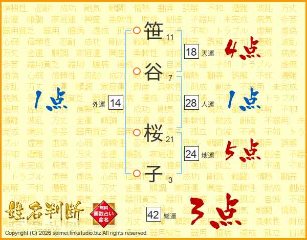 笹(11画)谷(7画) 桜(21画)子(3画)