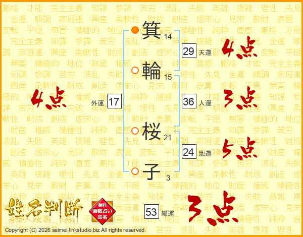 箕(14画)輪(15画) 桜(21画)子(3画)