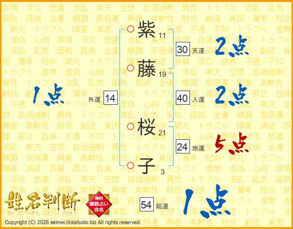 紫(11画)藤(19画) 桜(21画)子(3画)