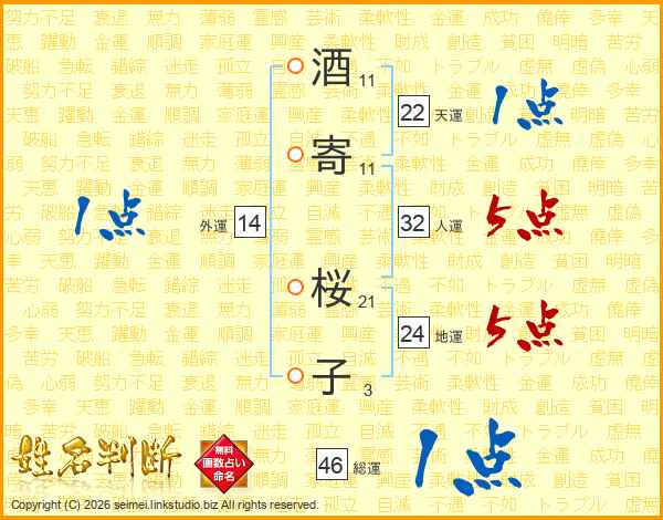 酒(11画)寄(11画) 桜(21画)子(3画)