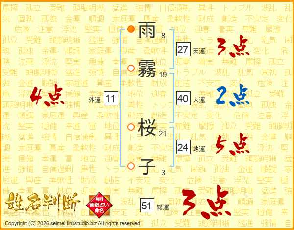 雨(8画)霧(19画) 桜(21画)子(3画)