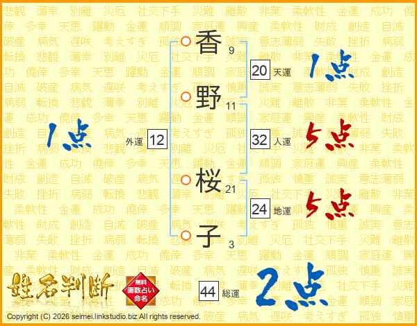 香野桜子さんの総運は44画の2点!