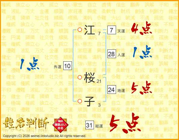 生活面を象徴する運勢です。外部から受ける影響力を表し、結婚運、家庭運や職場、環境への順応性を表します。総運から人運を引いた画数。姓や名が1文字の場合を除く。