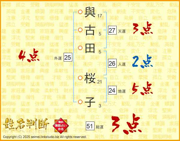 與(17画)古(5画)田(5画) 桜(21画)子(3画)