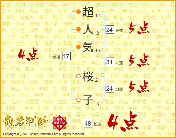 超(12画)人(2画)気(10画) 桜(21画)子(3画)