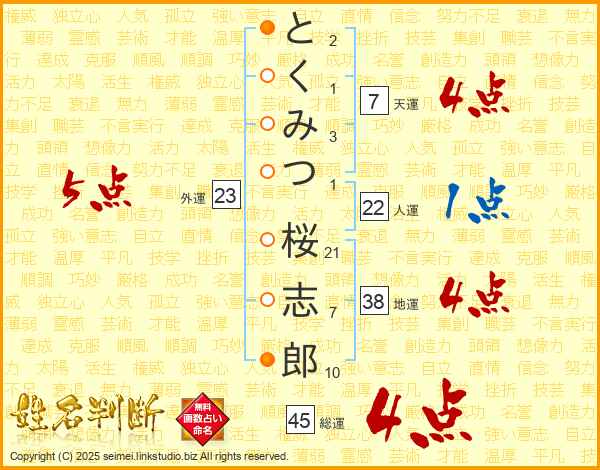 と(2画)く(1画)み(3画)つ(1画) 桜(21画)志(7画)郎(10画)