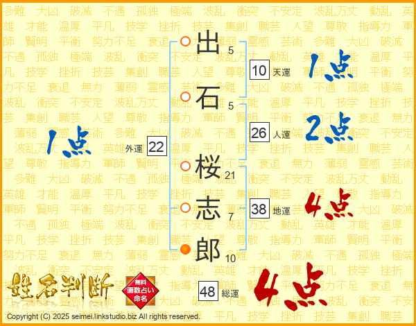 出(5画)石(5画) 桜(21画)志(7画)郎(10画)