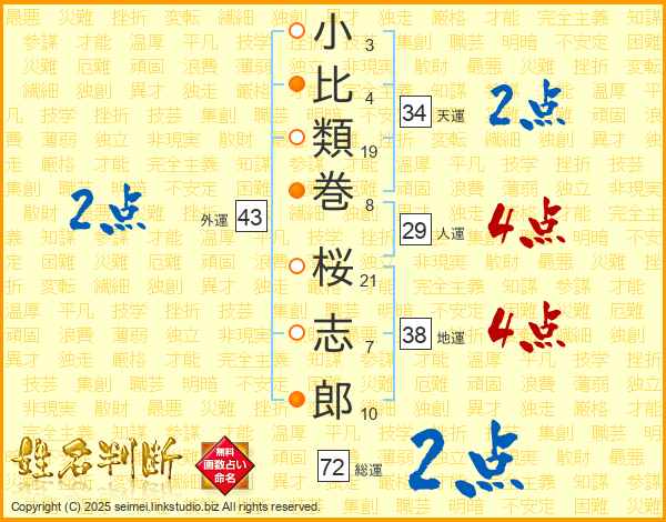 小(3画)比(4画)類(19画)巻(8画) 桜(21画)志(7画)郎(10画)
