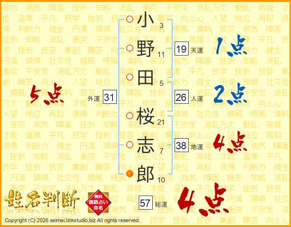 小(3画)野(11画)田(5画) 桜(21画)志(7画)郎(10画)