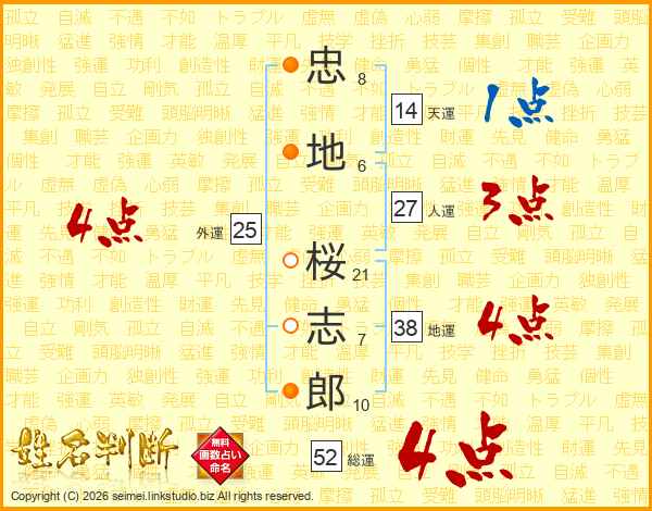 忠(8画)地(6画) 桜(21画)志(7画)郎(10画)