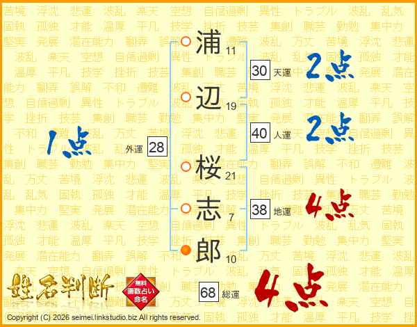 浦(11画)辺(19画) 桜(21画)志(7画)郎(10画)