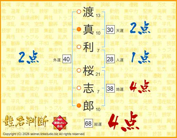 渡(13画)真(10画)利(7画) 桜(21画)志(7画)郎(10画)