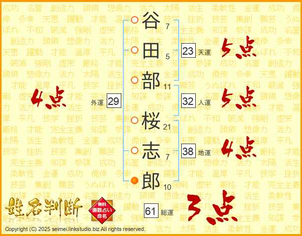 谷(7画)田(5画)部(11画) 桜(21画)志(7画)郎(10画)