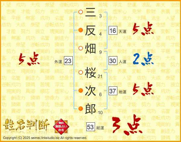 三(3画)反(4画)畑(9画) 桜(21画)次(6画)郎(10画)