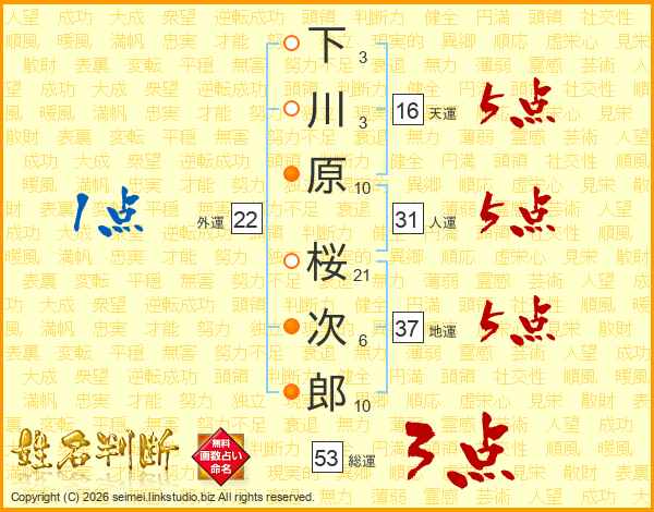 下(3画)川(3画)原(10画) 桜(21画)次(6画)郎(10画)