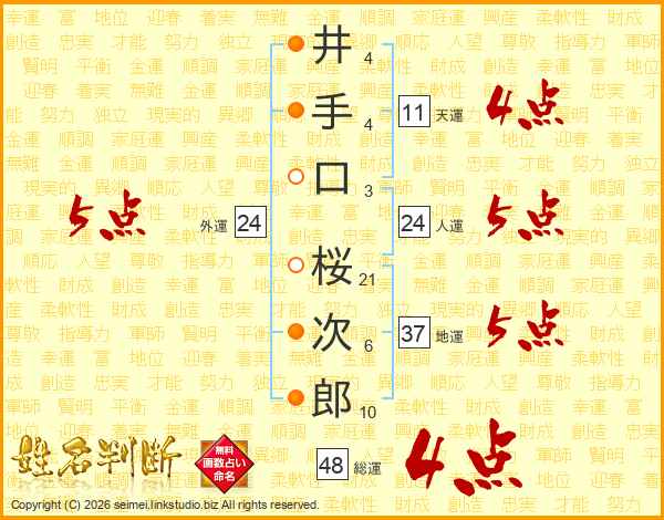 井(4画)手(4画)口(3画) 桜(21画)次(6画)郎(10画)