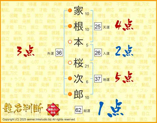 家(10画)根(10画)本(5画) 桜(21画)次(6画)郎(10画)