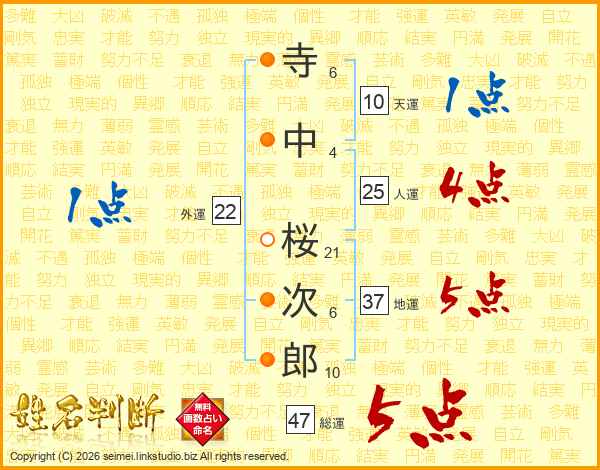 寺(6画)中(4画) 桜(21画)次(6画)郎(10画)