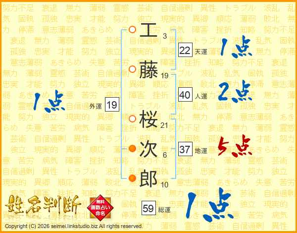 工(3画)藤(19画) 桜(21画)次(6画)郎(10画)