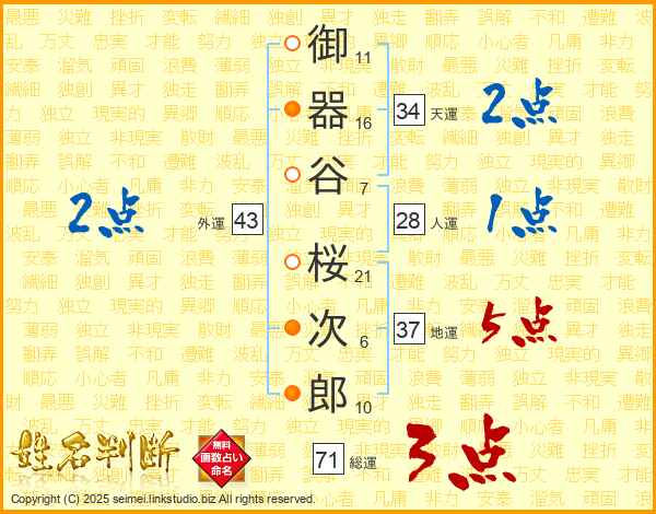 御(11画)器(16画)谷(7画) 桜(21画)次(6画)郎(10画)