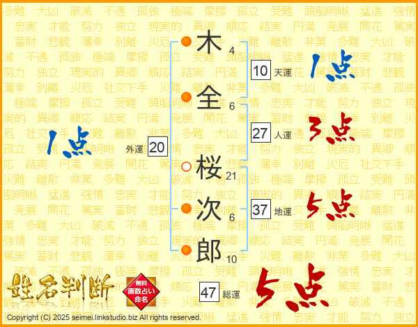 木(4画)全(6画) 桜(21画)次(6画)郎(10画)