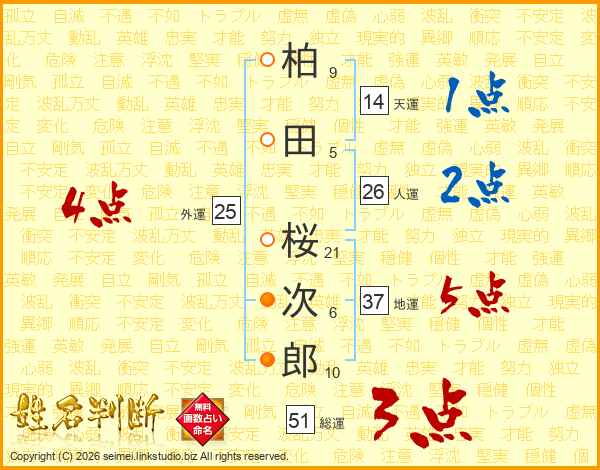 柏(9画)田(5画) 桜(21画)次(6画)郎(10画)