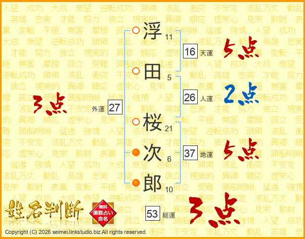 浮(11画)田(5画) 桜(21画)次(6画)郎(10画)