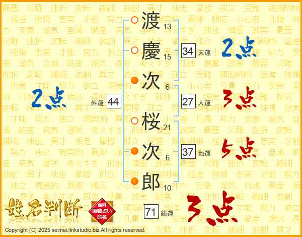 渡(13画)慶(15画)次(6画) 桜(21画)次(6画)郎(10画)