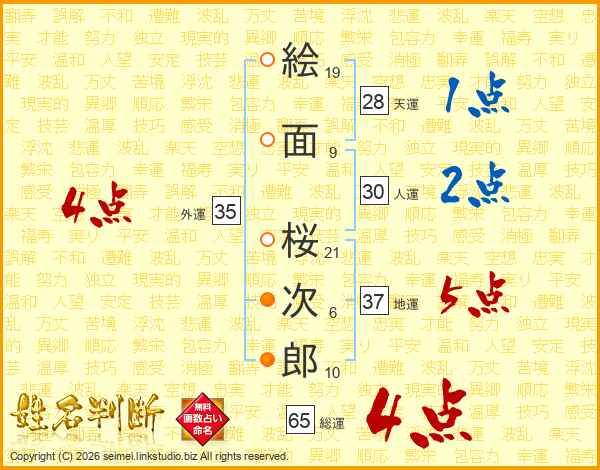 絵面桜次郎さんの総運は65画の4点!