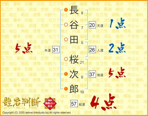 長(8画)谷(7画)田(5画) 桜(21画)次(6画)郎(10画)