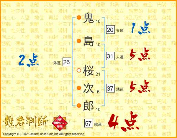 鬼(10画)島(10画) 桜(21画)次(6画)郎(10画)