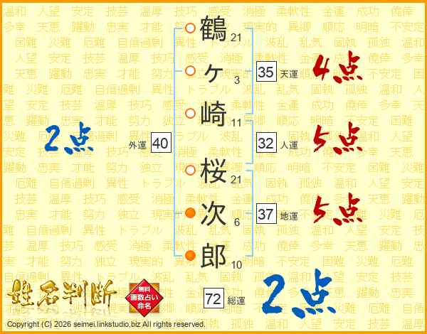 鶴ヶ崎桜次郎さんの総運は72画の2点!