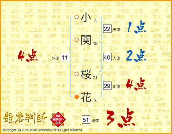 生活面を象徴する運勢です。外部から受ける影響力を表し、結婚運、家庭運や職場、環境への順応性を表します。総運から人運を引いた画数。姓や名が1文字の場合を除く。