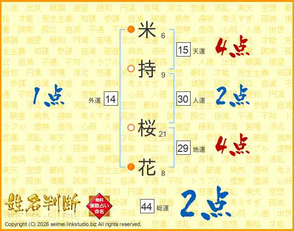 生活面を象徴する運勢です。外部から受ける影響力を表し、結婚運、家庭運や職場、環境への順応性を表します。総運から人運を引いた画数。姓や名が1文字の場合を除く。