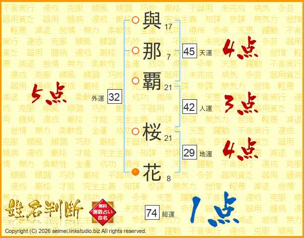與(17画)那(7画)覇(21画) 桜(21画)花(8画)