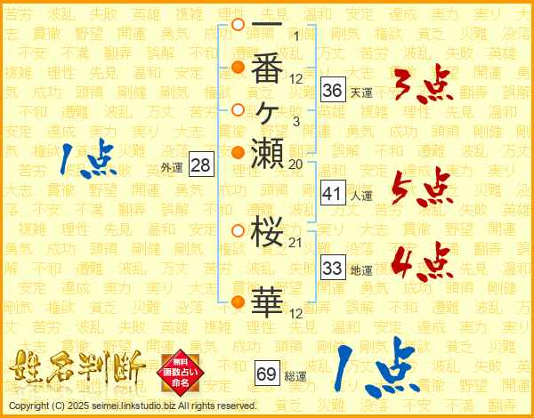一(1画)番(12画)ヶ(3画)瀬(20画) 桜(21画)華(12画)